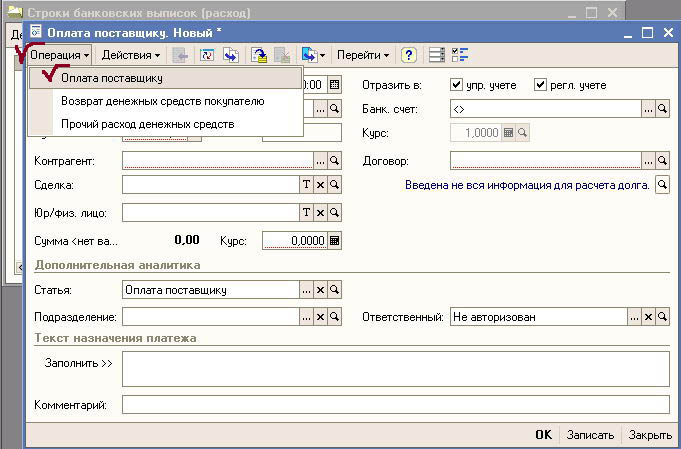 10.Оформите строку банковской выписки для учёта оплаты поставщику "Б".